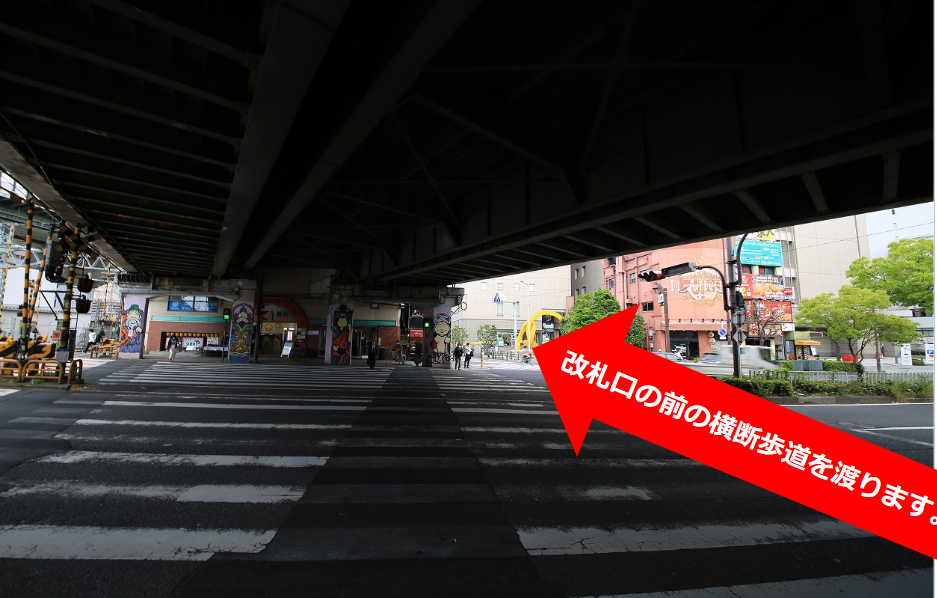 ①改札口の前の横断歩道を渡ります。