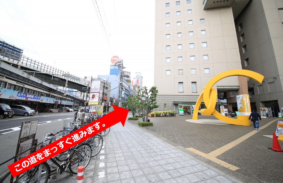 ②ホテル阪神の側道を、JR高架に沿うように直進して下さい。